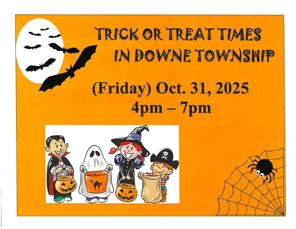 Downe Township’sTrick or Treat HoursFriday, October 31, 20254 pm – 7 pm https://downetwpnj.org/wp-content/uploads/2016/08/4.jpg 0 0 Nicole - Downe Twp. Admin. Assistant https://downetwpnj.org/wp-content/uploads/2016/08/4.jpg Nicole - Downe Twp. Admin. Assistant2025-10-17 09:53:232025-10-17 09:53:23Downe Township’sTrick or Treat HoursFriday, October 31, 20254 pm – 7 pm