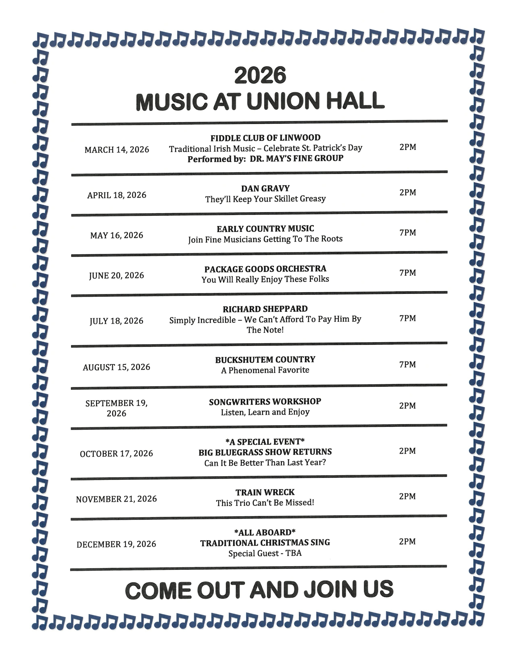 Music at Union Hall events will be held Union Hall (904 Main Street, Dividing Creek, NJ) at 7 pm, unless otherwise specified.